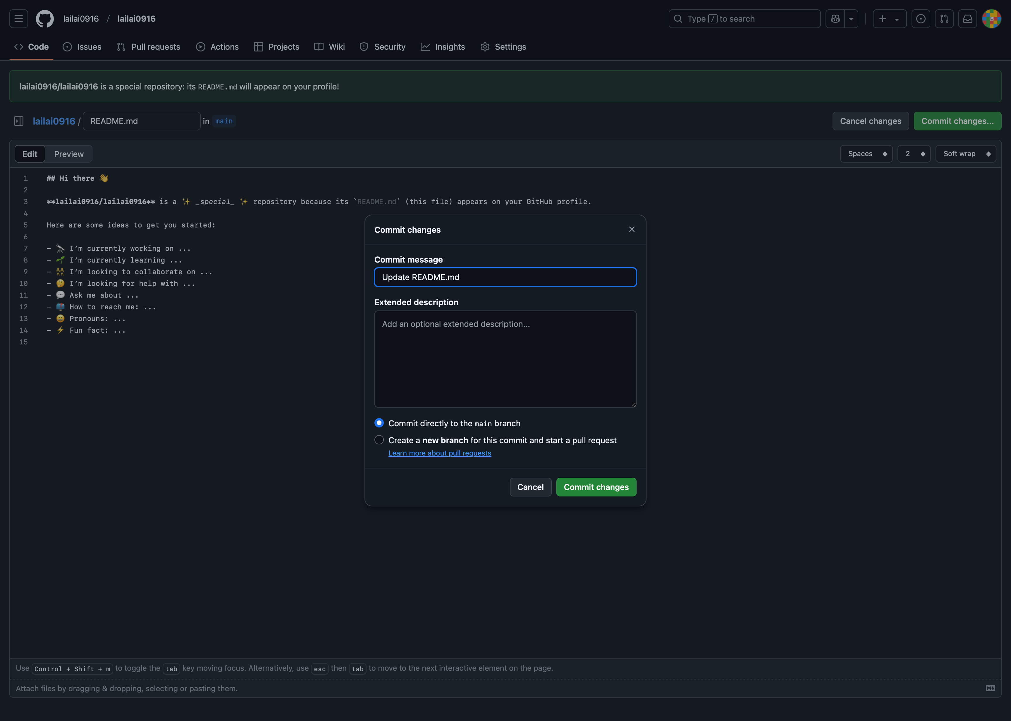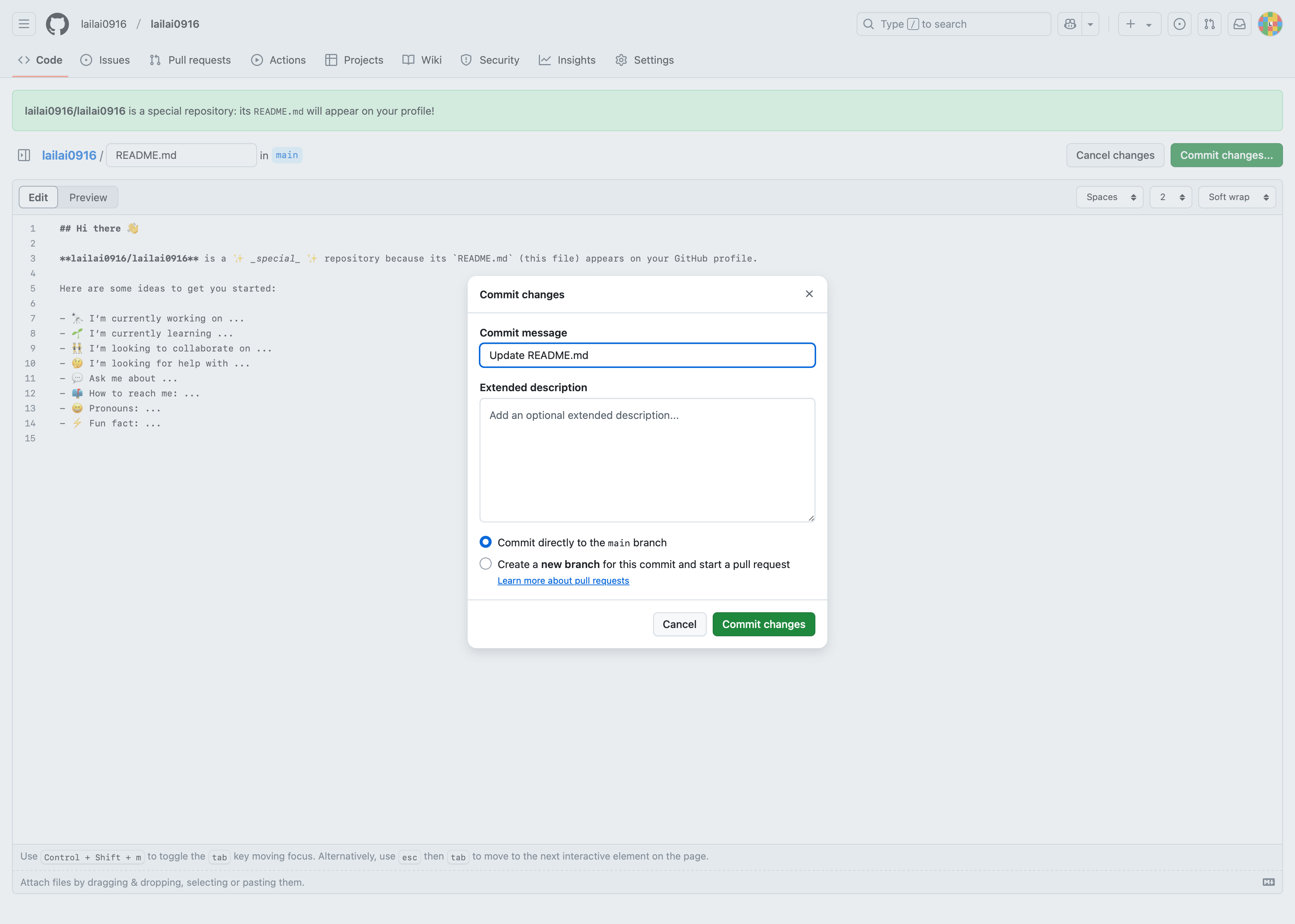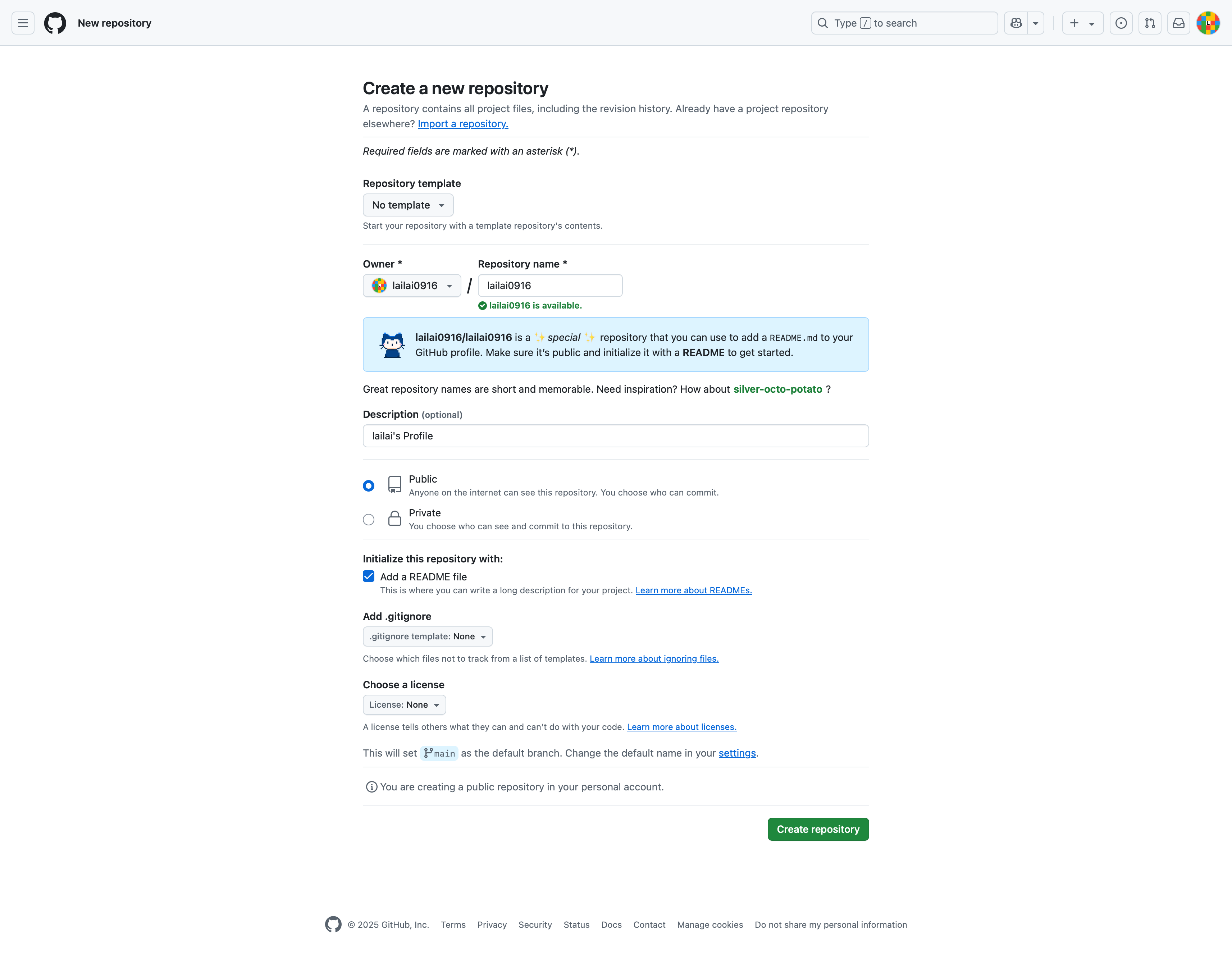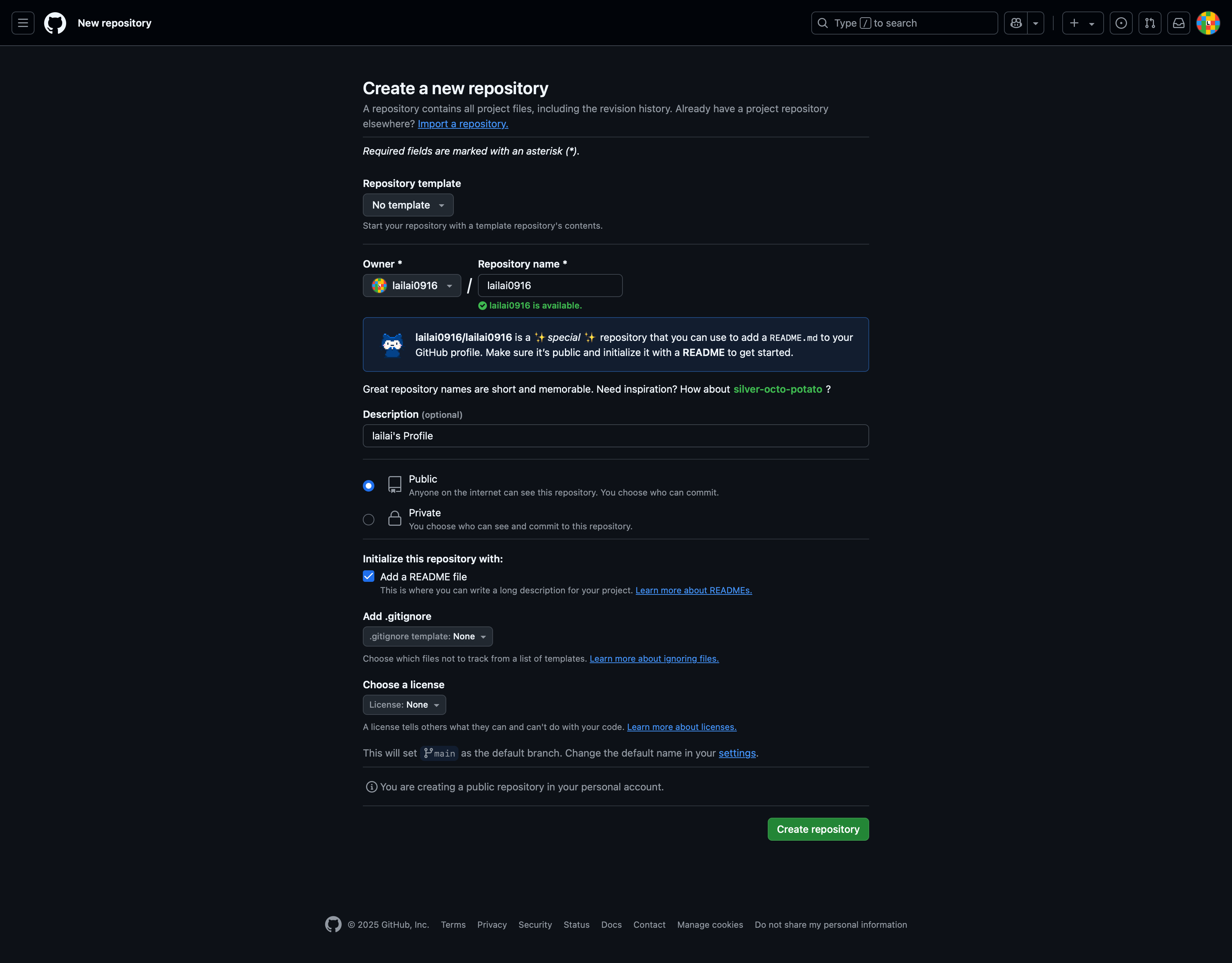 lailai0916/lailai0916(将lailai0916替换为你的 GitHub 用户名)。 - Description(描述)为可选项,例如
