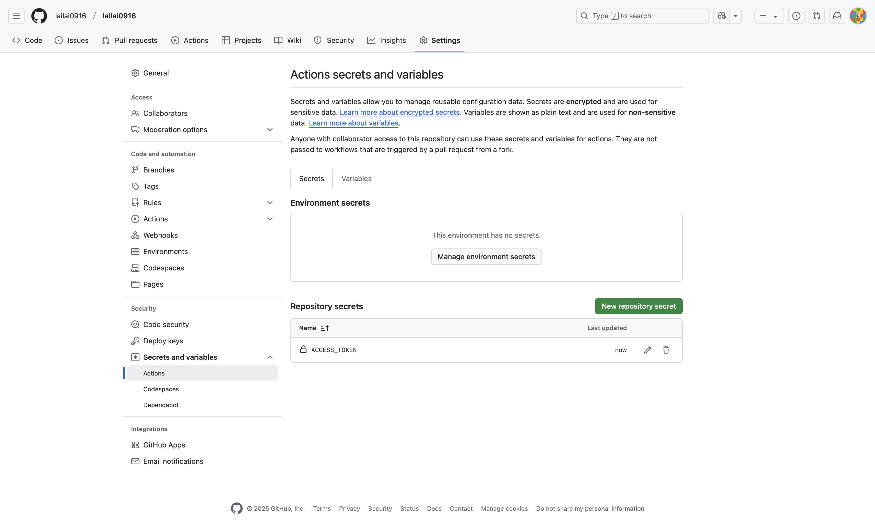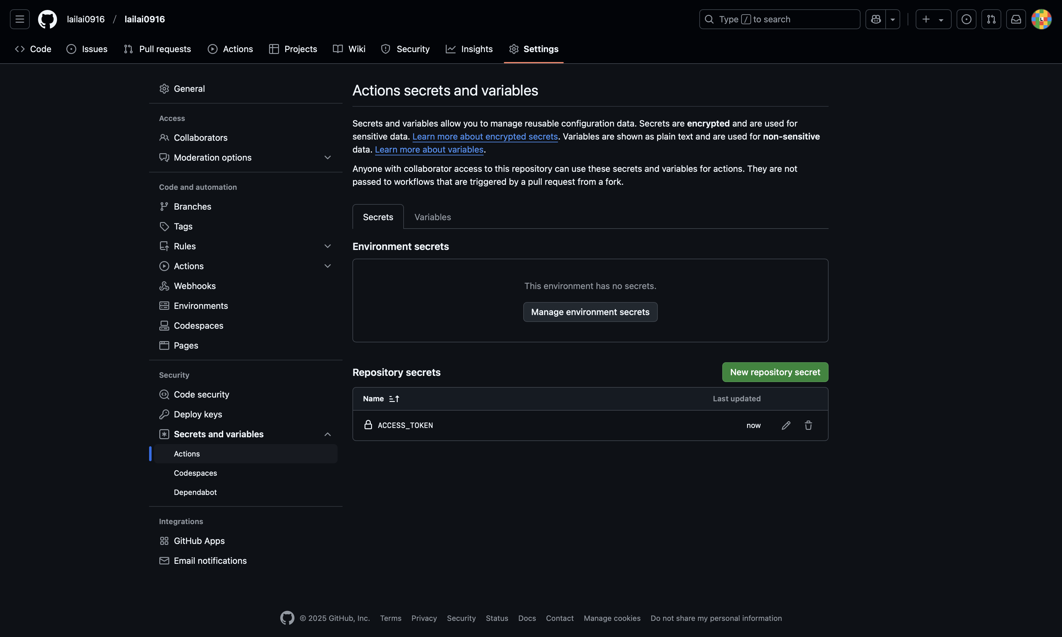 ACCESS_TOKEN,将 Secret(密钥)设置为刚才保存的令牌。 - 点击 Add secret(添加密钥)。