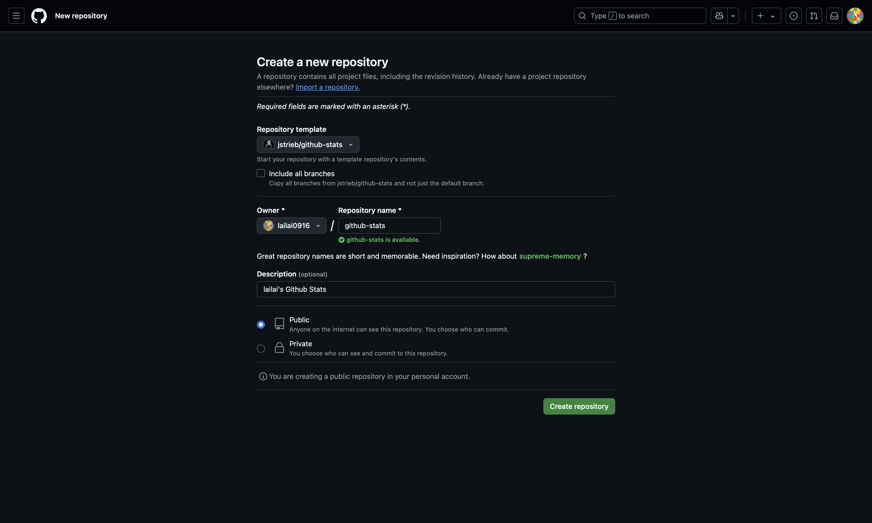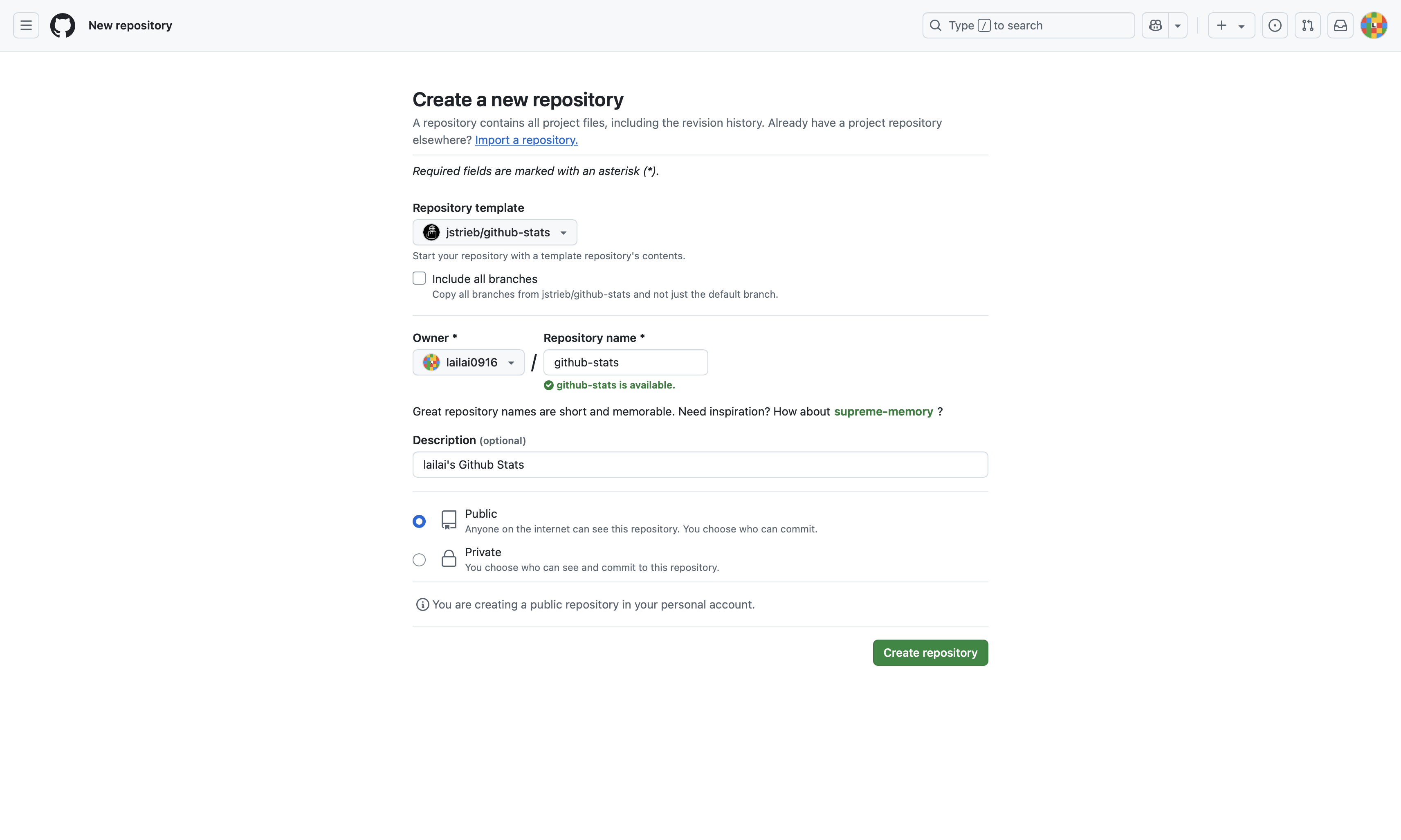 lailai0916/github-stats和lailai's GitHub Stats。 - 点击 Create repository(创建仓库)。
