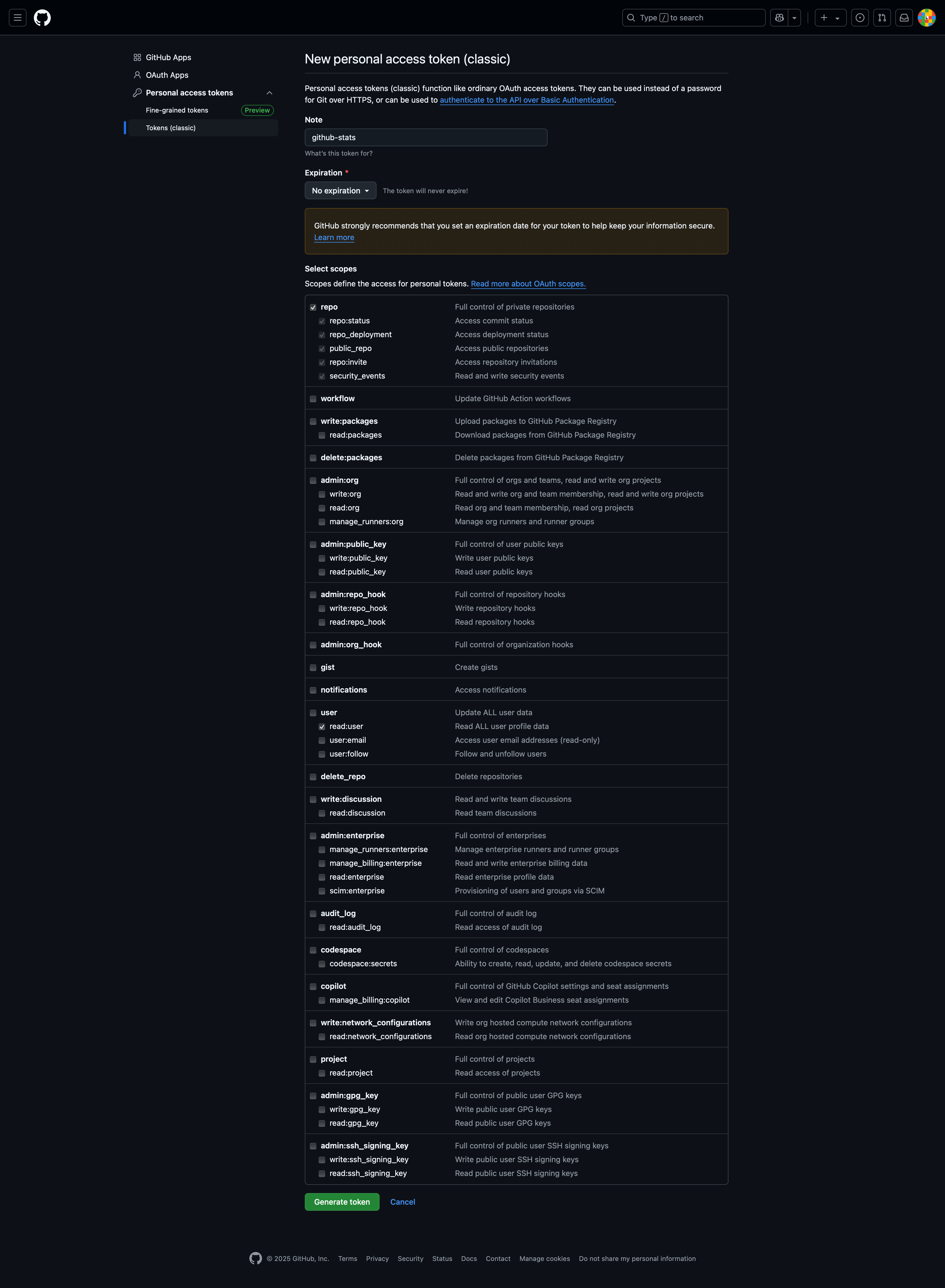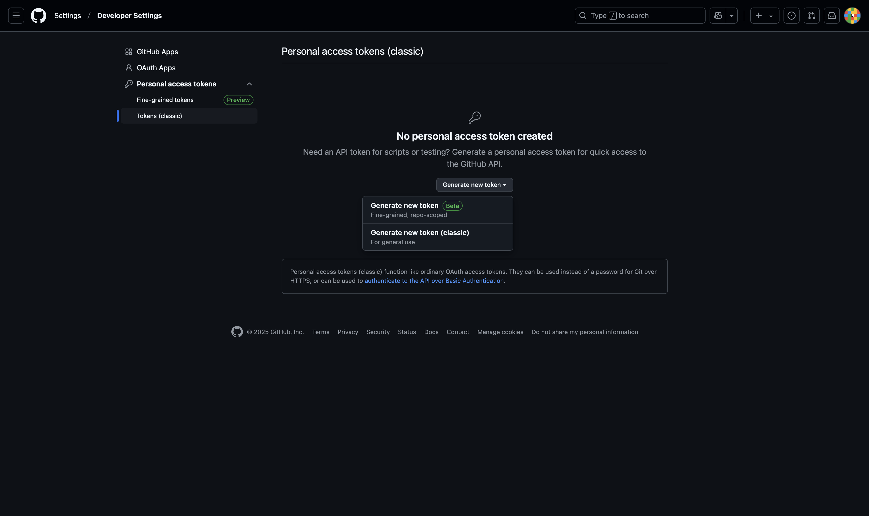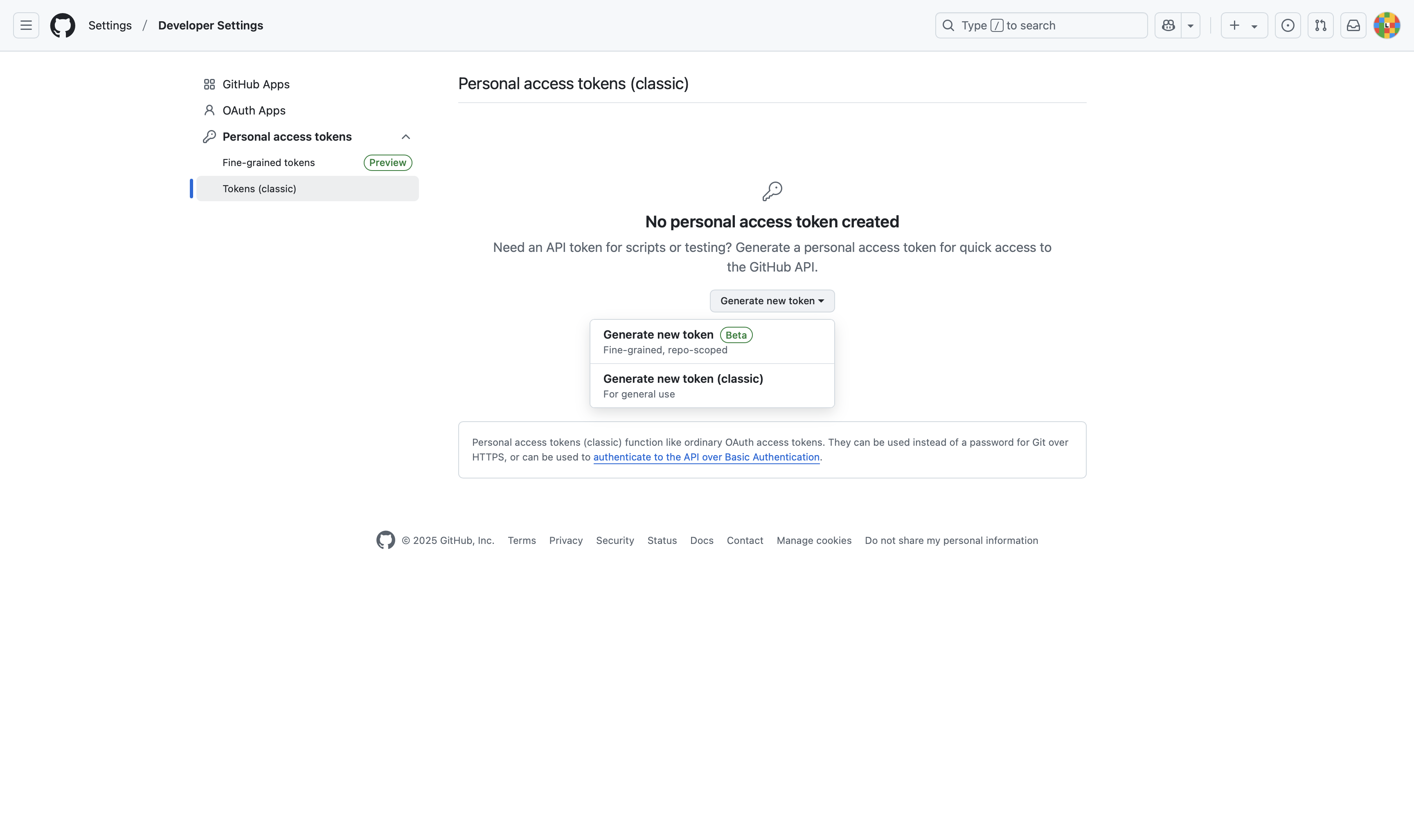 - 依次点击 Developer settings Personal access tokens Tokens (classic) Generate new token Generate new token (classic)。
