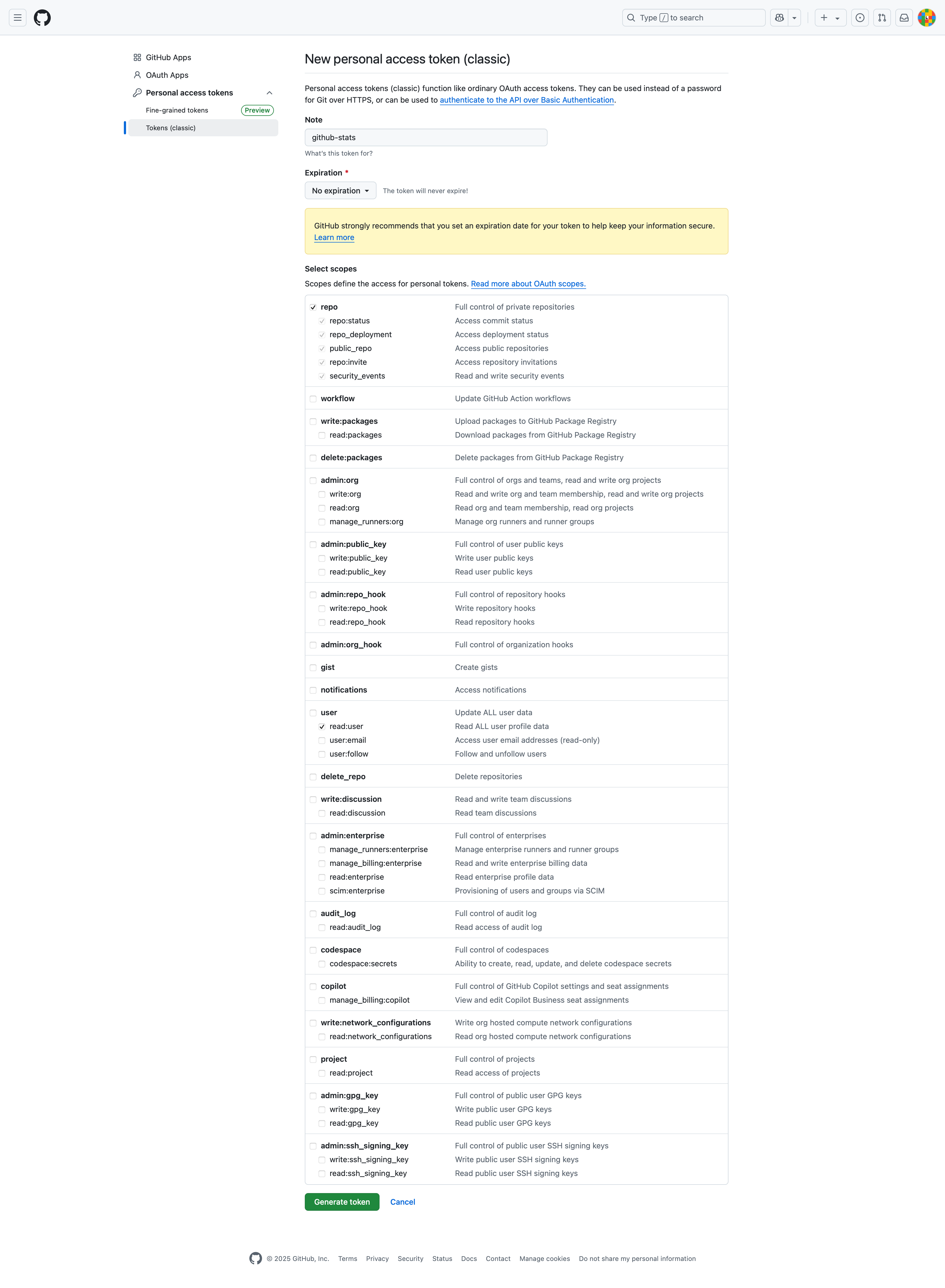 read:user和repo权限。 - 点击 Create token(创建令牌)。