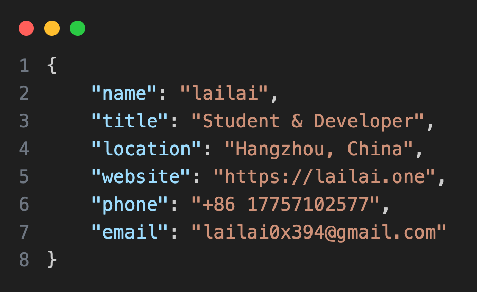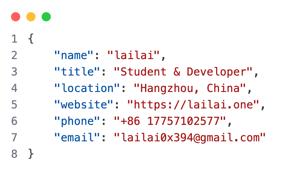 名片2025年7月13日 · 阅读需 1 分钟lailai学生 & 开发者使用 VSCode 的 CodeSnap 插件制作了一套 JSON 风格的个人名片。 效果展示 正面反面 代码 business-card.json{ "name": "lailai", "title": "Student & Developer", "location": "Hangzhou, China", "website": "https://lailai.one", "phone": "+86 17757102577", "email": "lailai0x394@gmail.com"}